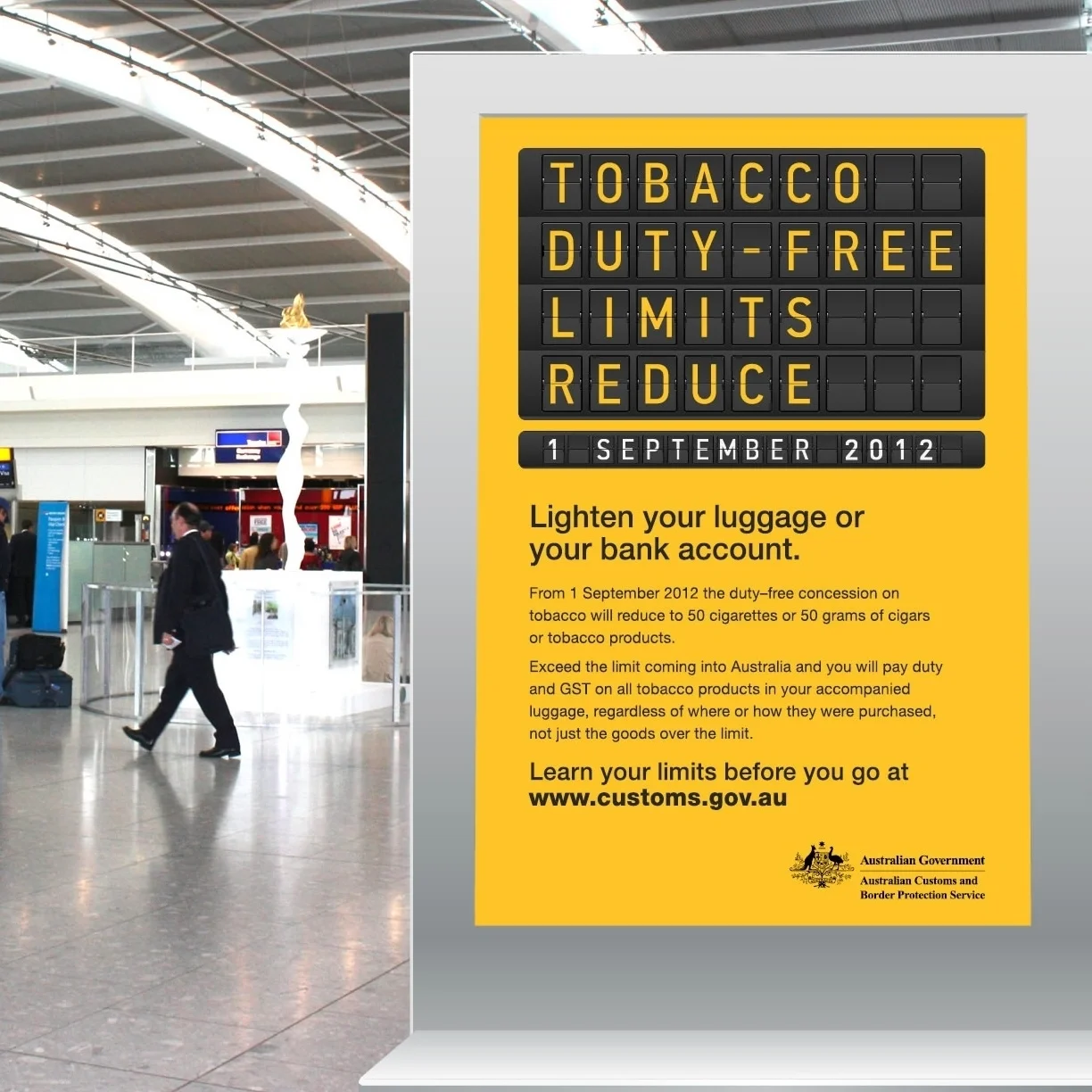 To inform travellers that the allowance for bringing tobacco into Australia had been dramatically reduced, we created a simple campaign using the airport flip board to capture traveller attention with straight forward messaging.